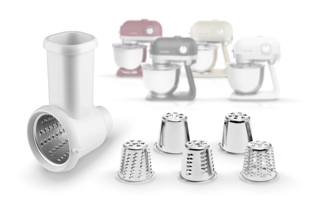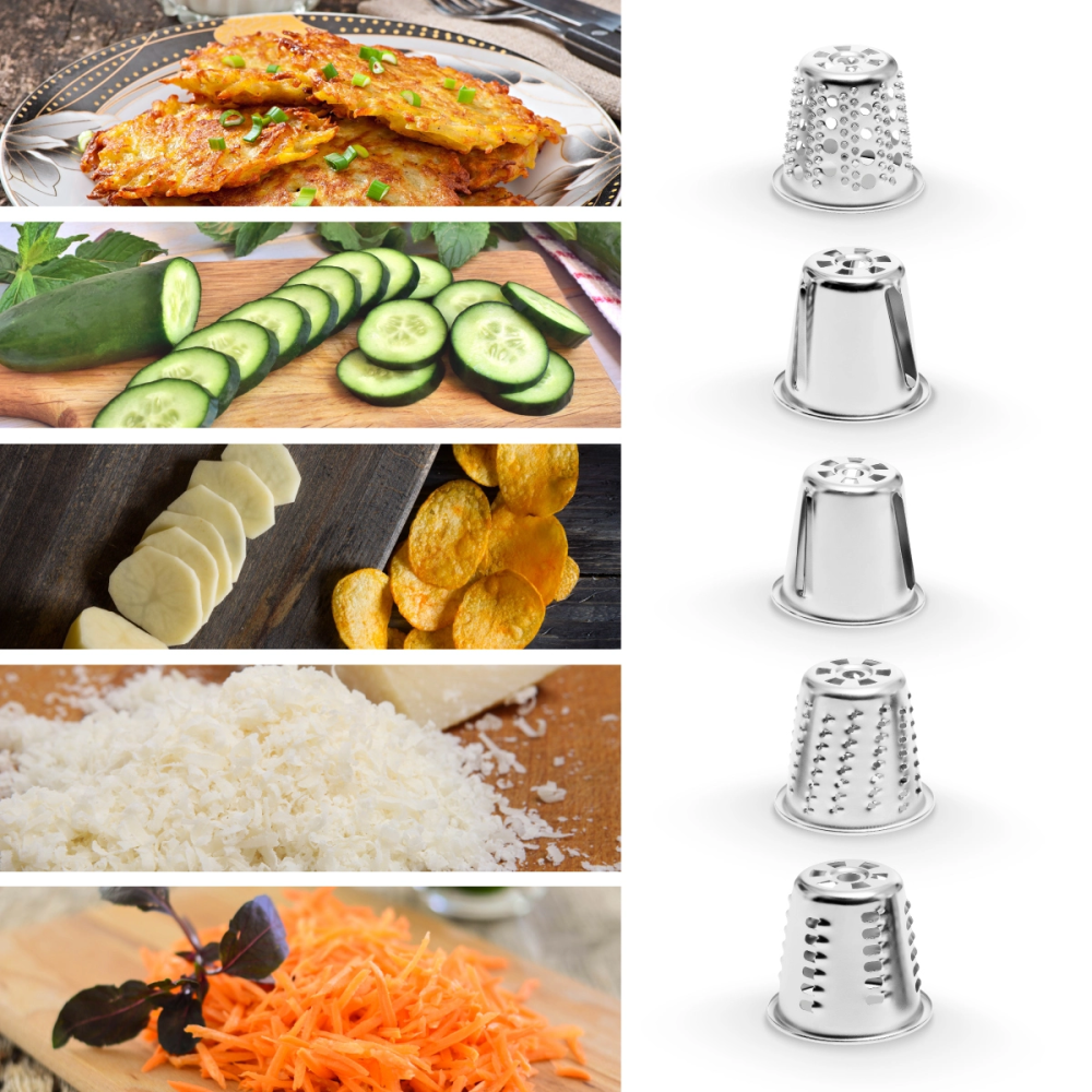 A reszelő 5 reszelőfelszereléssel van felszerelve: finom reszeléshez, durva reszeléshez, vékony és vastag szeletekhez, valamint egy speciális reszelő burgonyachipshez. Megkönnyíti a gyümölcs- és zöldségsaláták és más kedvenc ételek elkészítését.