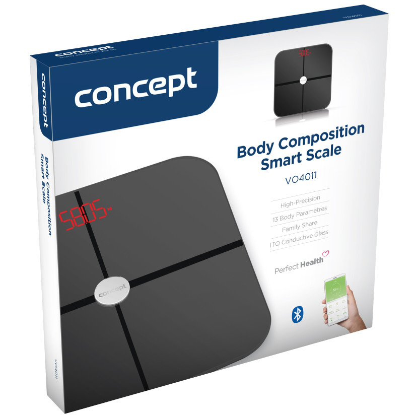 A Concept VO4011 Perfect Health személyi diagnosztikai mérleg átfogó testelemzést biztosít. 180 kg teherbírást kínál, és 13 testparamétert képes mérni bioelektromos impedancia segítségével. A Feelfit segítségével minden adatot a kezében tarthat.
