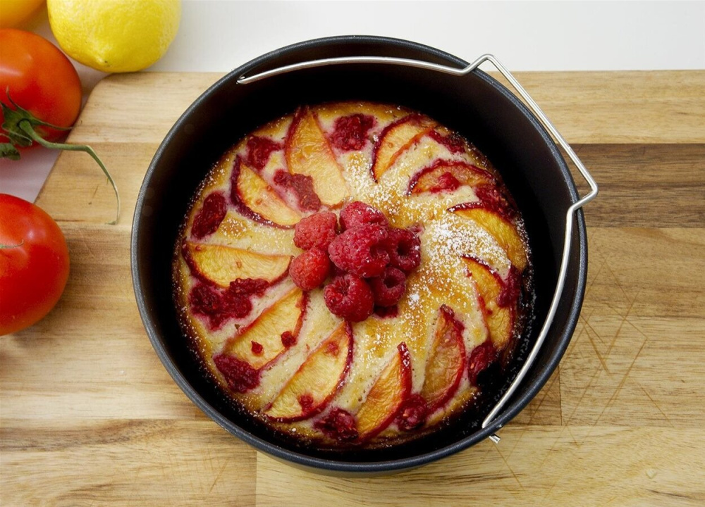 A süteményformával a forrólevegős sütő igazán sokoldalú konyhai segédeszközzé válik. Süssön illatos gyümölcstortát, pihe-puha csokoládétortát, őszinte házi kenyeret vagy dolgozza fel a maradék zöldségeket sós pitévé. A forma praktikus fogantyúval van ellátva, hogy könnyen kezelhető legyen, amikor kiveszi a sütőből. A pizzaformához hasonlóan a tortaforma tartós tapadásmentes felületét is értékelni fogja.