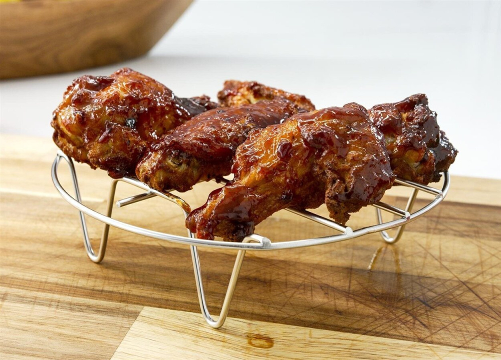 A Cosori forrólevegős fritőz tartozékkészletében egy rozsdamentes acélból készült állványt is talál, amelyet különösen húsok, halak vagy nyársak készítésekor használhat. Az állvány lehetővé teszi, hogy a forró levegő az alulról áramoljon, így az eredmény egy igazán egyenletesen átsült étel lesz.
