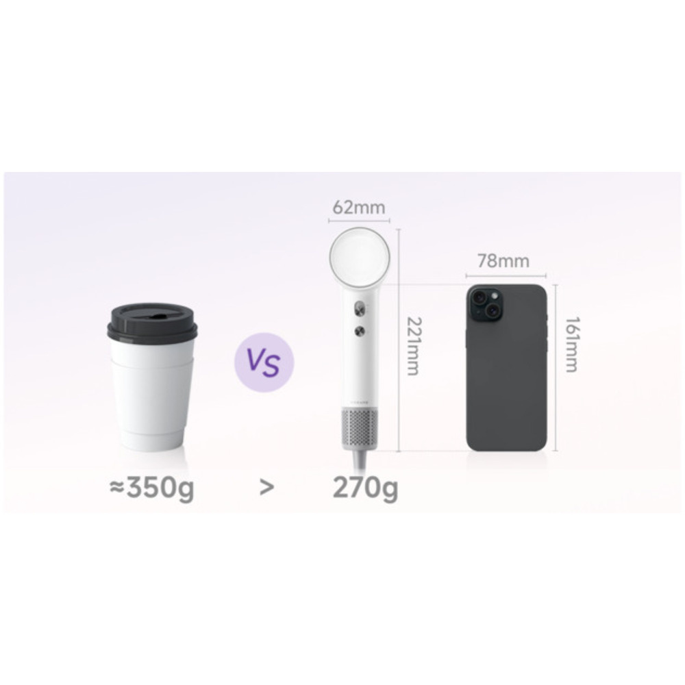 A Dreame Hair Mini hajszárító középpontjában egy fejlett , 100 000 fordulat/perc sebességű motor áll . Nagy sebességnél akár 70 m/s, alacsony sebességnél pedig 55 m/s sebességű, erőteljes légáramot generál. Ennek ellenére a készülék súlya mindössze 270 gramm, átmérője pedig mindössze 62 milliméter, ami kényelmes kezelhetőséget és precíz formázást biztosít.