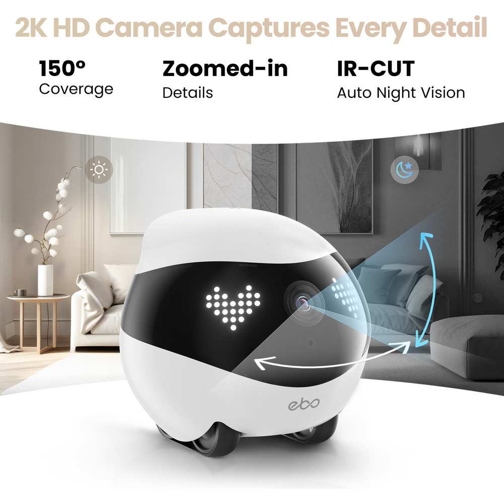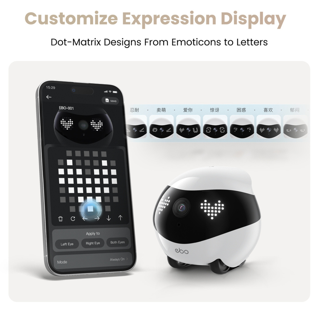 Az EBO Air 2 rendelkezik egy pár pixeles kijelzőamelyek szemeket szimulálnak, és barátságos, játékos jelleget kölcsönöznek neki. Ezek a az animált szemek képesek kifejezést váltani a helyzettől függően - töltés, mozgás vagy kommunikáció közben. A felhasználó a hangulatnak vagy a környezetnek megfelelően testre szabhatja a szemek megjelenését. Ez a részlet nemcsak egy intelligens kamerává, hanem az egész család szimpatikus társává is teszi.
