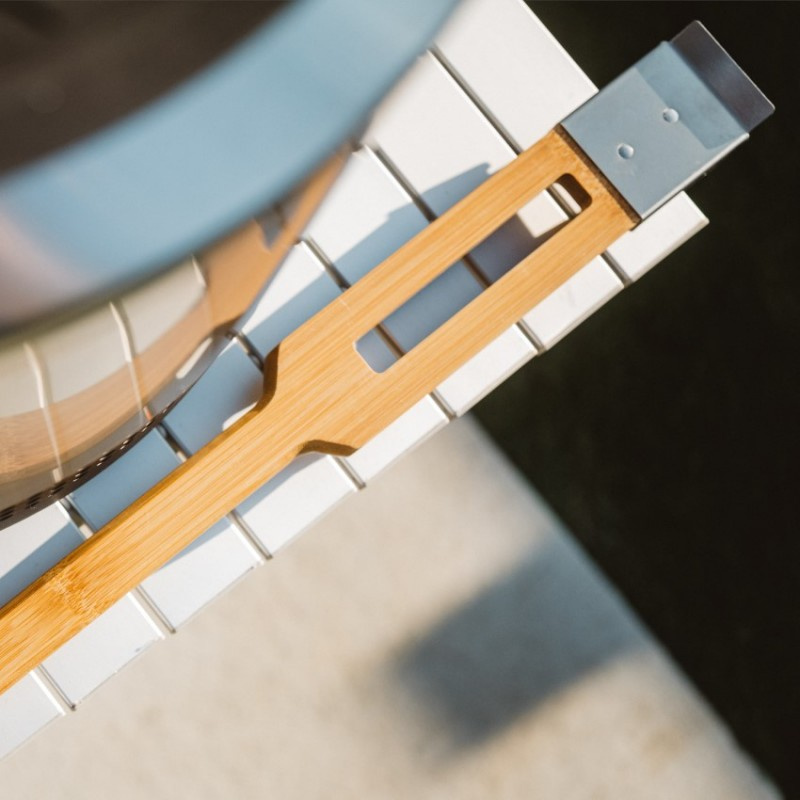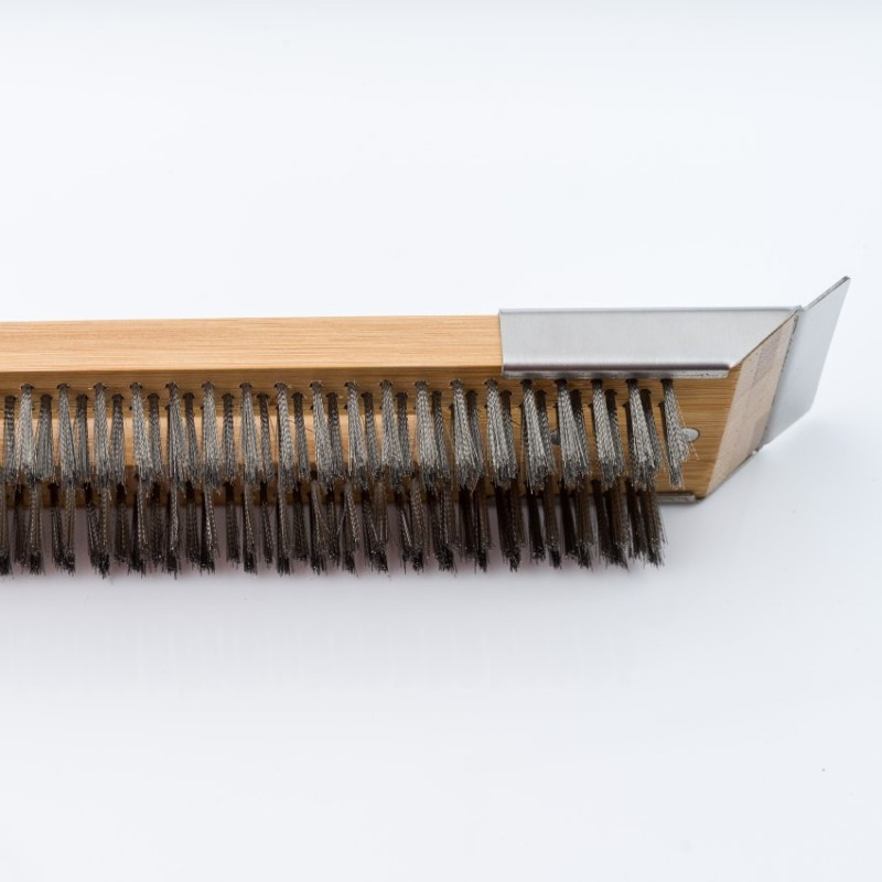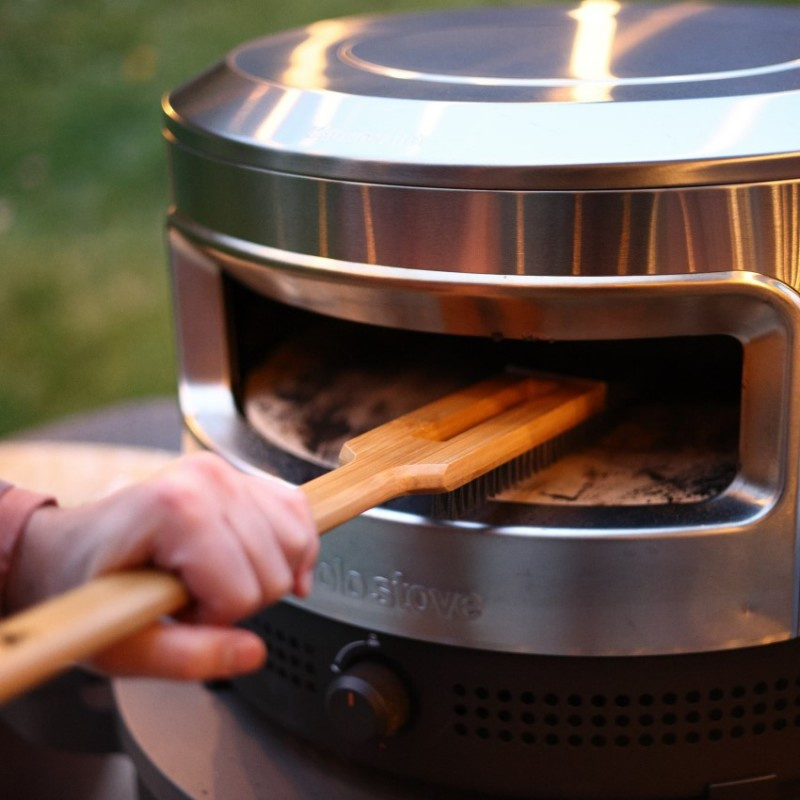 Solo Stove rozsdamentes acél sörtés kefe a kerámia pizzakövek tökéletes karbantartásához. Hatékonyan eltávolítja az odaégett ételmaradékokat. A kefe másik oldalán található rozsdamentes acél kaparó ezután tökéletesen alkalmas a nagyobb égett maradványok eltávolítására. A hosszú fa nyél kényelmesen illeszkedik a kézbe. Praktikus pánt a felakasztáshoz.