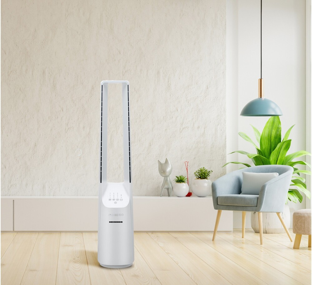 A HTFB-M33WH oszlopos ventilátor hat sebességfokozatot és három üzemmódot kínál - természetes, éjszakai és intelligens. Az intelligens üzemmódban hőmérsékletérzékelő segítségével automatikusan szabályozza a légáramlást a helyiség hőmérsékletének megfelelően. A CycloneFlow technológiának köszönhetően hatékonyan hűti a 8-10 m²-es helyiségeket 60°-os áramlási szöggel.