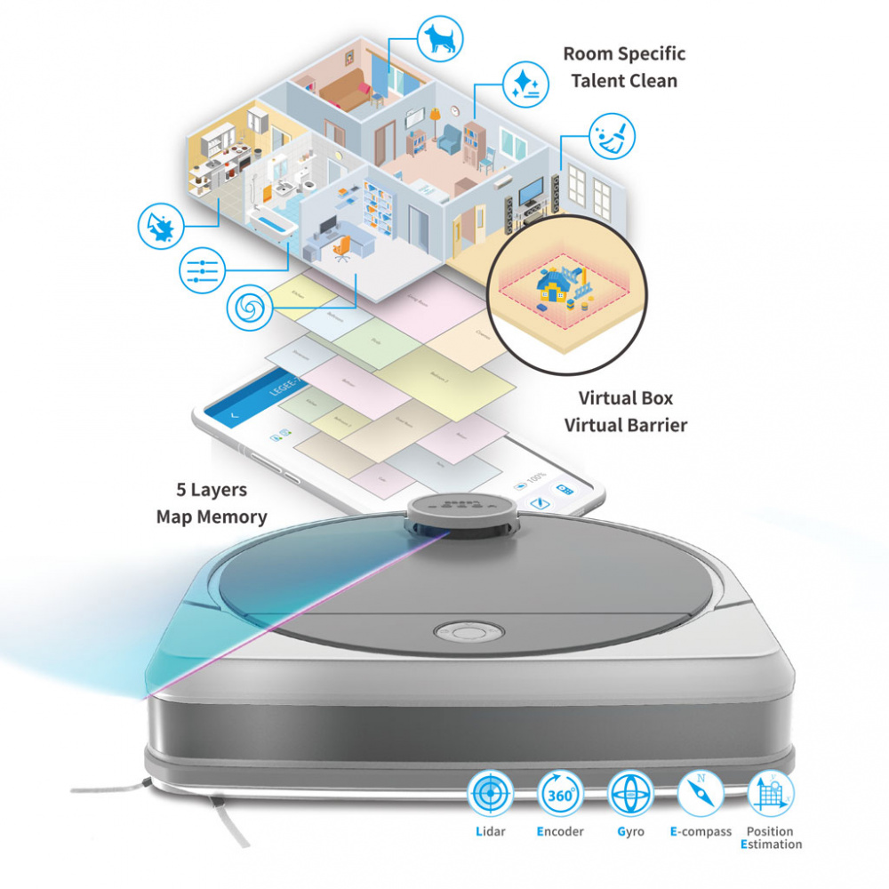 A robotporszívók fontos tulajdonsága a térben való tájékozódás és mozgás. A Legee 7 robot feltörlő mop pontos lézeres helymeghatározást és feltérképezést használ. A fejlett LEGEE SLAM navigációs rendszer LDS LiDAR, Encoder, Gyro és E-iránytű segítségével méri, értékeli és optimalizálja a tisztítási útvonalat. A tisztítást szisztematikusan és a lehető leghatékonyabban végzi, szükségtelen késleltetések nélkül.