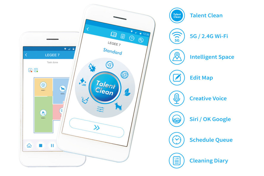 Annak érdekében, hogy még jobb eredményeket érjen el különböző típusú padlók tisztításakor, az alkalmazásban választhat a hét előre beállított tisztítási mód egyike közül vagy egy egyedi beállítást is. A Talent Clean előre beállított tisztítási módokkal a Legee 7 speciálisan kialakított takarítórendszerrel tisztítja a különböző mértékékben szennyezett padlókat.