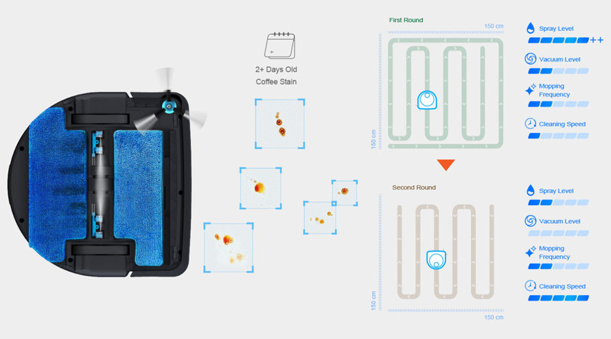 A LEGEE SLAM egy új, részletes és pontos térképet mutat be információkkal és a helyiségek elrendezésével. A valós idejű térkép a kitakarított területet jeleníti meg, ill. a takarítás során ellenőrizheti a Legee 7 robot felmosó mop akkumulátorának állapotát is. A robotmop akár 5 tisztító térképet is képes megjegyezni, melyeket a memóriában tárol. A mentett térképeket akkor használja, amikor egy másik emeletet takarít a házban.