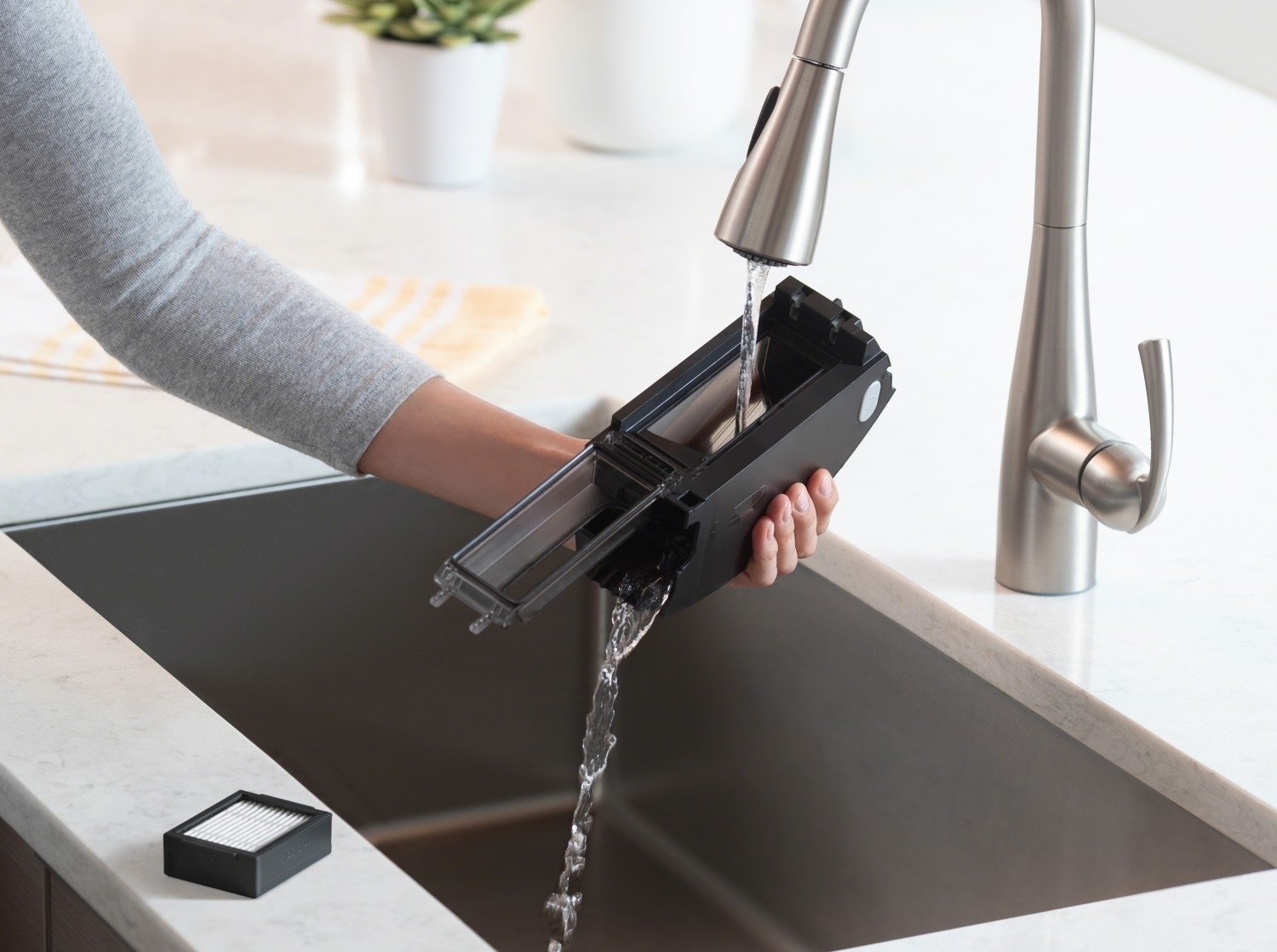 A Roomba nagy kapacitású szennygyűjtő tartállyal rendelkezik, amely a legfinomabb porszemcséket HEPA szűrővel fogja fel. Az AeroForce gyűjtőkosár vízzel átöblíthető a még könnyebb karbantartás érdekében.