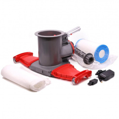 - Föld feletti medencékhez - porszívó durva szennyeződés előszűrővel, felfújható medencékhez is alkalmas, szennyzsákkal, kézi porszívó cserélhető fúvókákkal, kis kefével, szívótömlővel 750 cm hosszú, Ø 32 mm, teleszkópos rúd 279 cm hosszú, mosható előszűrő, kerekek az egyenletes nyomásért, min. szűrési teljesítmény 3028 l/h.