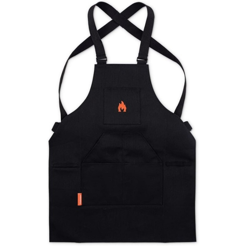Kötény Solo tűzhely kötény modern fekete színben, narancssárga lánggal az elején. A nyak és a derék körüli állítható pántokkal a kötényt bárki viselheti. Hat zsebe biztosítja, hogy a legszükségesebb dolgok mindig kéznél legyenek. A kötény megvédi ruháját a szennyeződéstől főzés és grillezés közben. Egy univerzális méret.