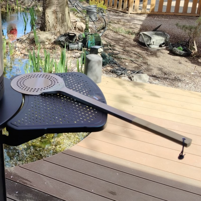 Perforált rozsdamentes acél pizzahéj extra hosszú nyéllel a Solo Stove pizzasütőkhöz. Ideális a kész pizzák és piték eltávolításához a forró sütőkövön. A spatula fa nyele tökéletesen illeszkedik a kézbe.