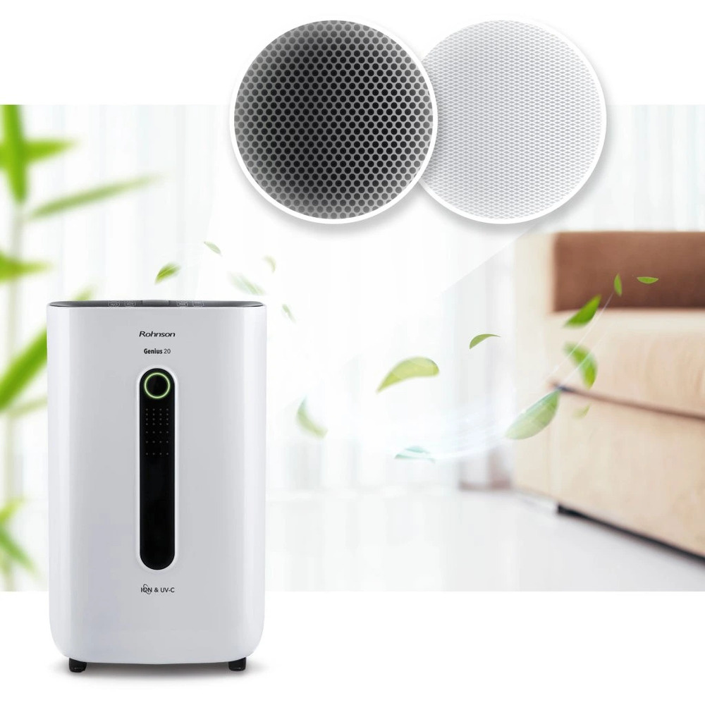 A csúcsmodell R-9920 Genius párátlanító forradalmasítja a levegőminőségről való gondoskodást. S napi 20 literes párátlanítási kapacitással hatékonyan szabályozza a páratartalmat akár 120 m². Egyedi kombináció UV-C sterilizáló lámpák a ionizációs szűrő a következőkkel együtt szénszűrő átfogó légtisztítást biztosít. Innovatív Wi-Fi kapcsolat lehetővé teszi a mobilalkalmazáson keresztül történő távvezérlést, ahol bárhonnan beállíthatja az időzítőt, szabályozhatja a páratartalmat és beállíthatja az egyéb funkciókat. S 195 m³/h-ig terjedő légáram és ergonomikus áramlási rendszerrel alacsony, csak 36 dB, ami garantálja a csendes és hatékony működést.