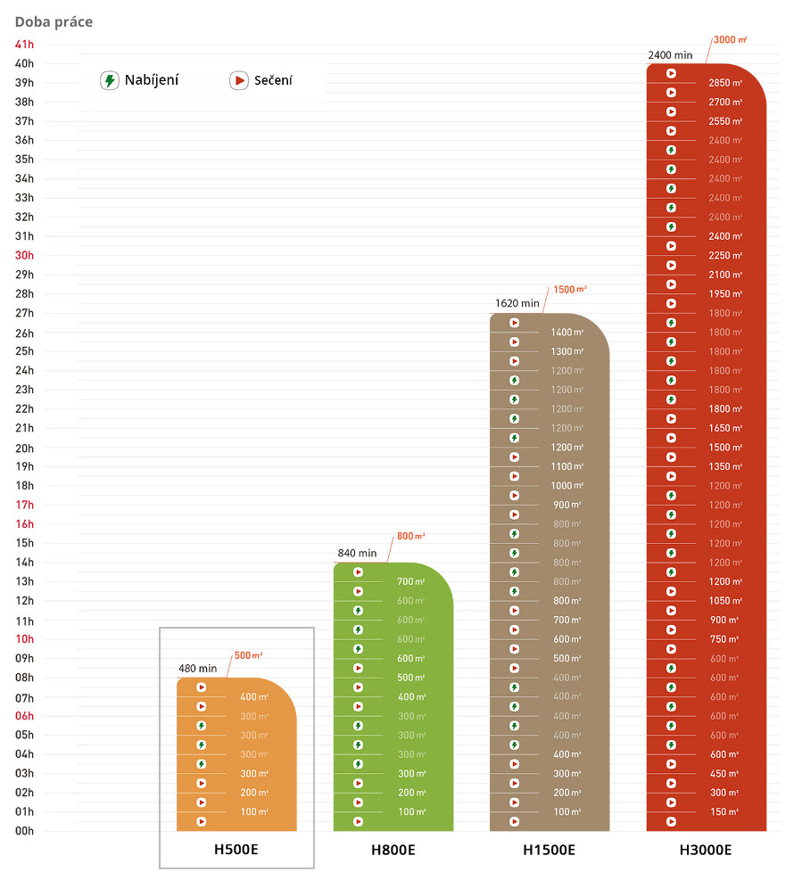 A töltési idő, az óránkénti teljesítmény és a hatékonyság modellről modellre változik. Az alábbi táblázat segítségével válassza ki a gyepméretének megfelelő modellt.