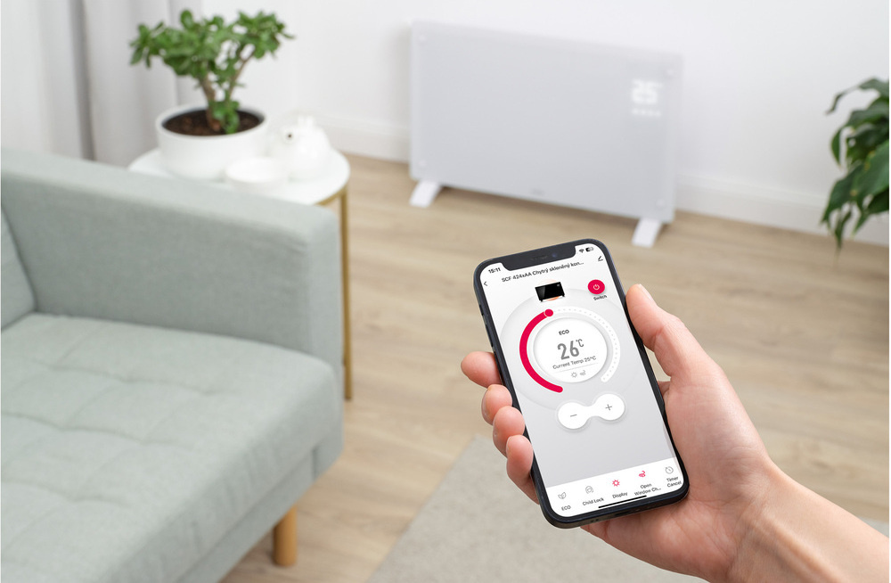 A kombinált Bluetooth és Wi-Fi chip megbízható kapcsolatot biztosít a mobilalkalmazással, amely részletes áttekintést nyújt a helyiség hőmérsékletéről, és lehetővé teszi a konvektor összes funkciójának távvezérlését.