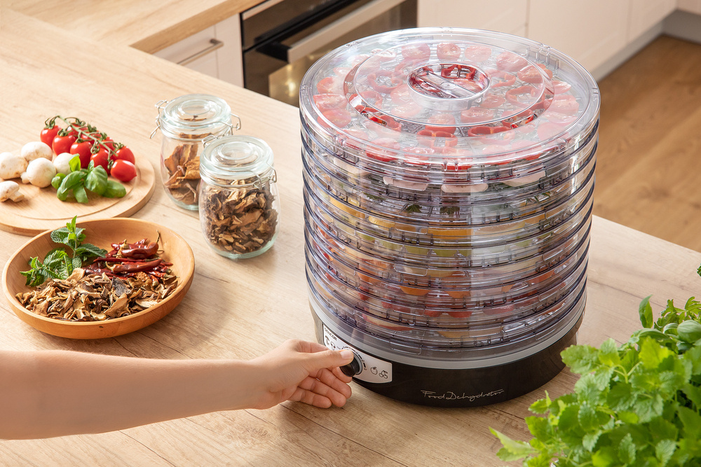 A beépített ventilátor biztosítja a meleg levegő optimális áramlását minden emeletre. A 35-80 °C között fokozatmentesen szabályozható hőmérsékletnek köszönhetően a szárító a fűszernövényektől a húskészítményekig sokféle alapanyagot képes kezelni. Az átlátszó tálcák lehetővé teszik a szárítási folyamat egyszerű ellenőrzését.