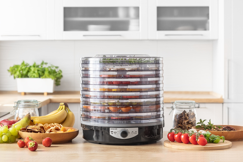 A SENCOR SFD 3109BK kilenc, 33 cm átmérőjű tányért kínál, és egyedülálló módon két különböző magasságot lehet beállítani a tányérok között. A szárítót egyetlen tálcáról lehet használni, amit kisebb mennyiségű alapanyag feldolgozásakor értékelni fog. A 330 x 195 x 330 mm-es kompakt méretek könnyű tárolást biztosítanak.