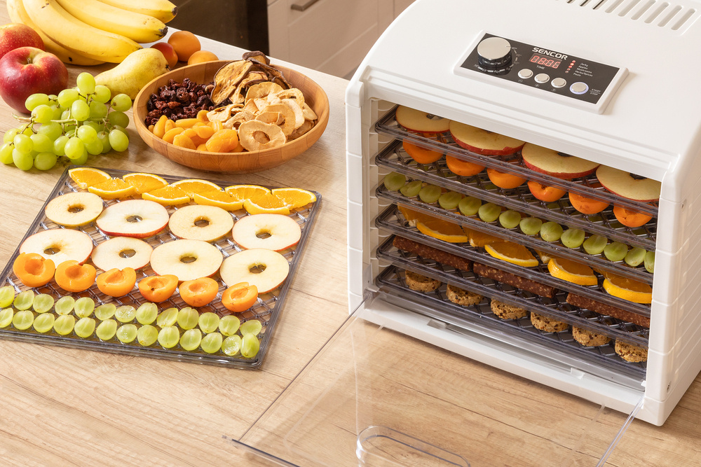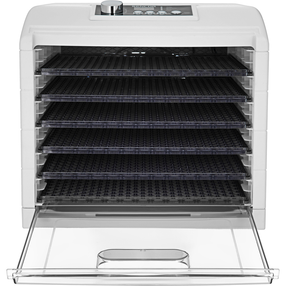 A SENCOR SFD 6500WH 0,59 m² szárítási felületet kínál, ami 33%-kal nagyobb, mint a hagyományos, 32 cm átmérőjű szárítóké. Hat kivehető műanyag tálca lehetővé teszi egyszerre akár 3 kg alapanyag feldolgozását (tálcánként 500 g). Kompakt méretének köszönhetően bármilyen konyhában elfér.