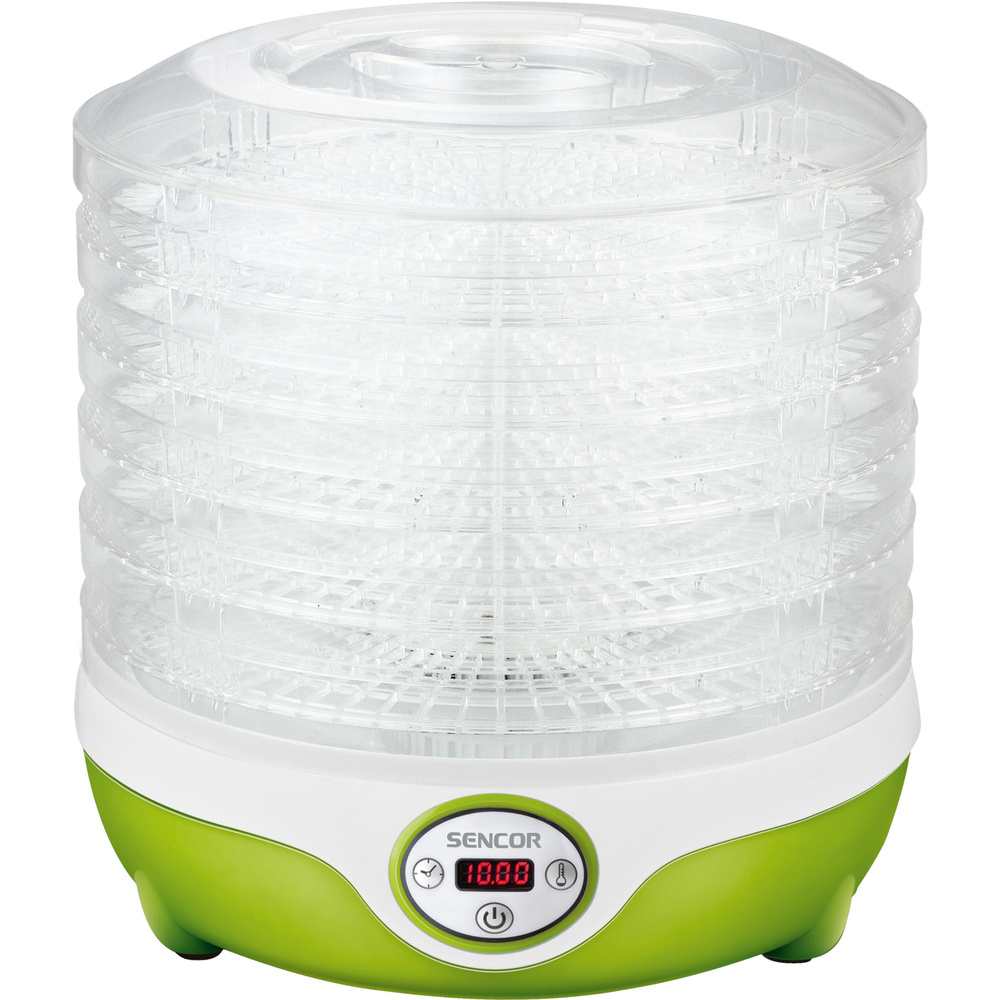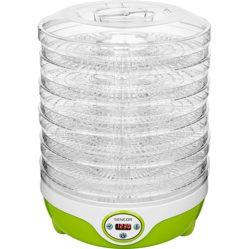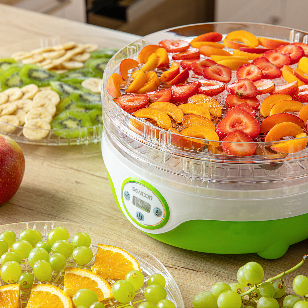 A SENCOR SFD 851GR öt, 25,5 cm átmérőjű, állítható magasságú tányért kínál. Az 1,5-2,8 cm-es változtatható tányérmagasság lehetővé teszi a különböző típusú alapanyagokhoz való optimális alkalmazkodást. A beépített ventilátor biztosítja a forró levegő egyenletes keringését a szárító minden szintjén, míg a speciális tányérkialakítás optimalizálja a légáramlást és megakadályozza a penészesedést.