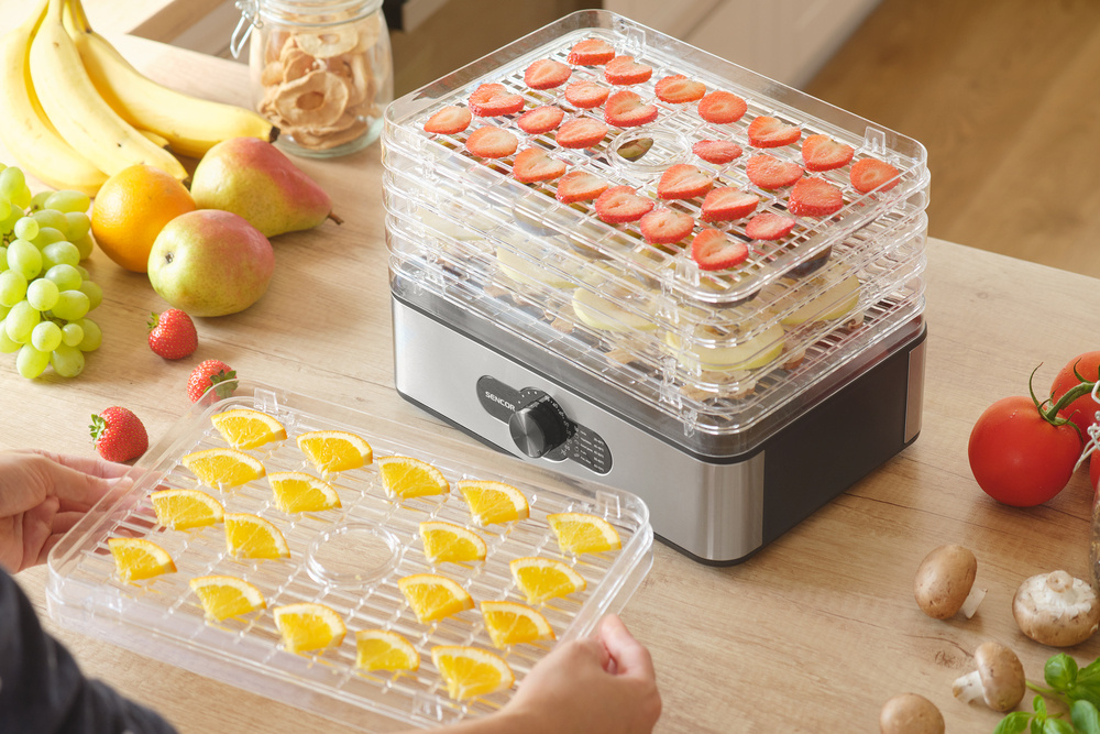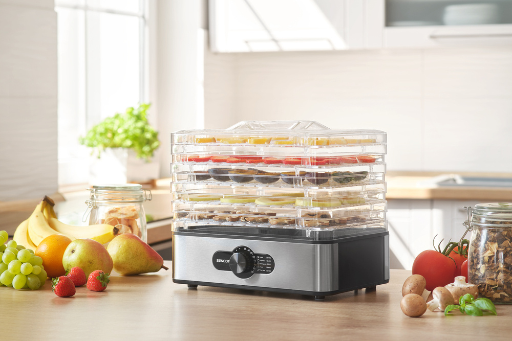 A SENCOR SFD 950SS öt hőálló, 29 x 20 cm-es műanyag tányért kínál. Az egyedülálló kialakítás lehetővé teszi, hogy a tálcák magassága a szárítandó élelmiszer típusától függően 16 vagy 29 mm-re állítható legyen. A beépített ventilátor biztosítja a forró levegő optimális keringését a szárító minden szintjén, míg a szárítótálcák rácsának speciális kialakítása megakadályozza a penészesedést és optimalizálja a légáramlást.