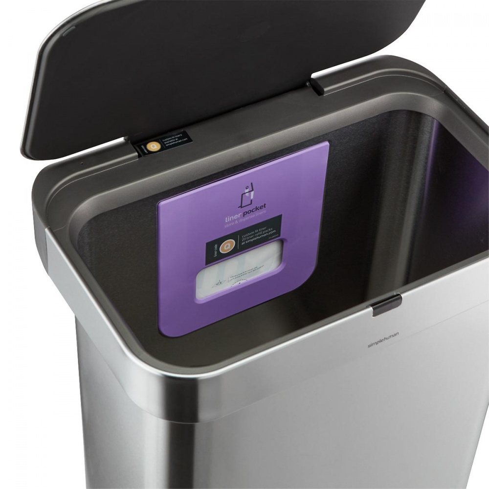 A beépített zacskó adagolónak köszönhetően az új zsák mindig kéznél lesz. A Simplehuman zacskók csomagja pontosan illeszkedik a kosárban lévő helyre. A zsák egy kézzel kényelmesen kihúzható