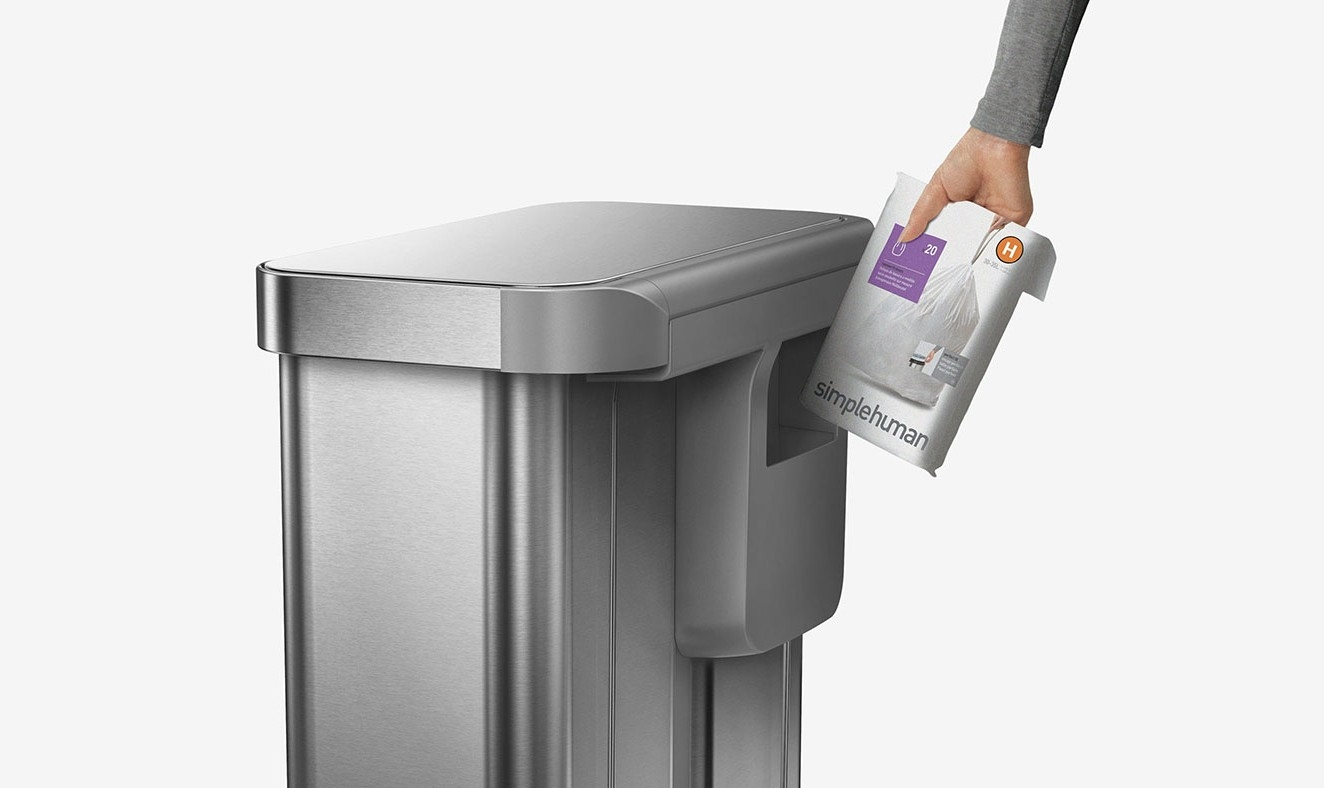 A Simplehuman kosarak tartalék zsákjainak csomagolását úgy tervezték, hogy pontosan illeszkedjen a kosár belsejében található beépített tartóba.