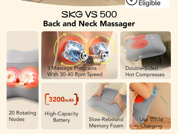 Élvezze a professzionális masszázs élményét otthon vagy útközben az SKG VS500 készülékkel. Ez a készülék 20 dinamikus masszázscsomópontot tartalmaz, amelyek a gyúrási technológia és a fordított nyomás révén egy profi masszázsterapeuta kezét utánozzák. A kétoldalú hőterápiával együtt ellazítják a merev izmokat, csökkentik a fáradtságot és javítják a vérkeringést. A 360°-os ergonomikus kialakítás kényelmes használatot biztosít a test kulcsfontosságú területein, például a nyakon, a vállakon, a csípőn és a combokon - akár az ágyban fekve, akár egy irodai székben ülve. A 3 sebességfokozat lehetővé teszi, hogy a masszázs intenzitását az Ön igényeihez igazítsa - akár a gyengéd relaxációt, akár a mélyebb izomfeszültségek oldását részesíti előnyben.