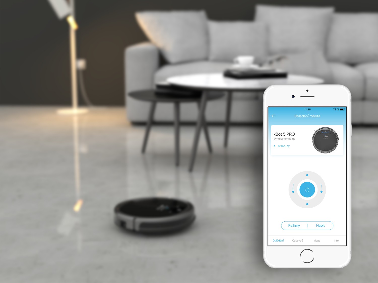 A robot segítője vezérléséhez csak a Symbo Home Blue mobilalkalmazás és egy intelligens eszköz szükséges, mobiltelefon vagy táblagép formájában. Most már teljes mértékben vezérelheti a robotporszívót távolról - függetlenül attól, hol tartózkodik és mikor. Telepítse az alkalmazást a Google Play-en vagy az Apple App Store-on keresztül. Indítsa el az alkalmazást és regisztrálja magát az első használat előtt. Az alkalmazás és a robot párosítása után kiválaszthatja például a tisztítás időzítését, az egyes módokat, vagy megnézheti a tisztítási térképet vagy a tisztítási statisztikákat.
