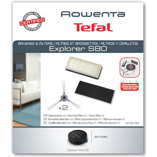 Csere porszűrő, szivacsszűrő és két oldalkefe Rowenta robotporszívóhoz. A készlet a 80-as sorozathoz - RR7755WH. A szűrők ajánlott cseréje körülbelül 4-6 hónap után, az oldalkefék ajánlott cseréje pedig 6-12 hónap után ajánlott, attól függően, hogy milyen gyakran és milyen felületen használják a porszívót.