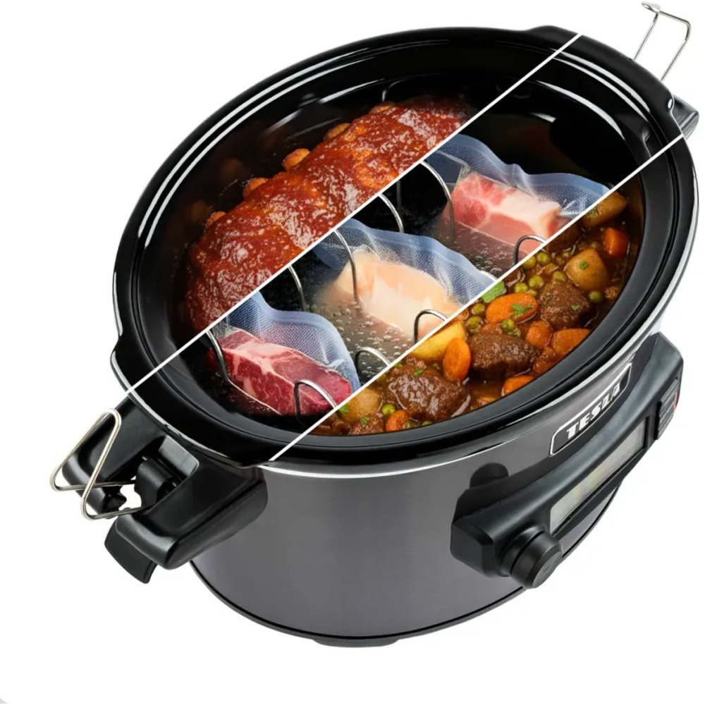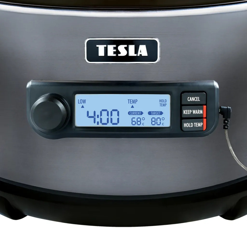 A TESLA SlowCook S900 Plus megbízható segítője a teljes értékű otthoni főzésnek a tűzhely melletti hosszas ácsorgás nélkül. Csak tegye bele a hozzávalókat, válassza ki a hőmérsékletet és az időt, a főző pedig elvégzi a többit. Pontos hőszabályozásának köszönhetően a készülék a vákuumzáras , vízfürdőben lévő ételek sous vide főzésére is képes. A beépített hőmérsékletmérő szonda ellenőrzi a hőmérsékletet, a zárószerkezettel ellátott üvegfedél pedig megkönnyíti a biztonságos szállítást.